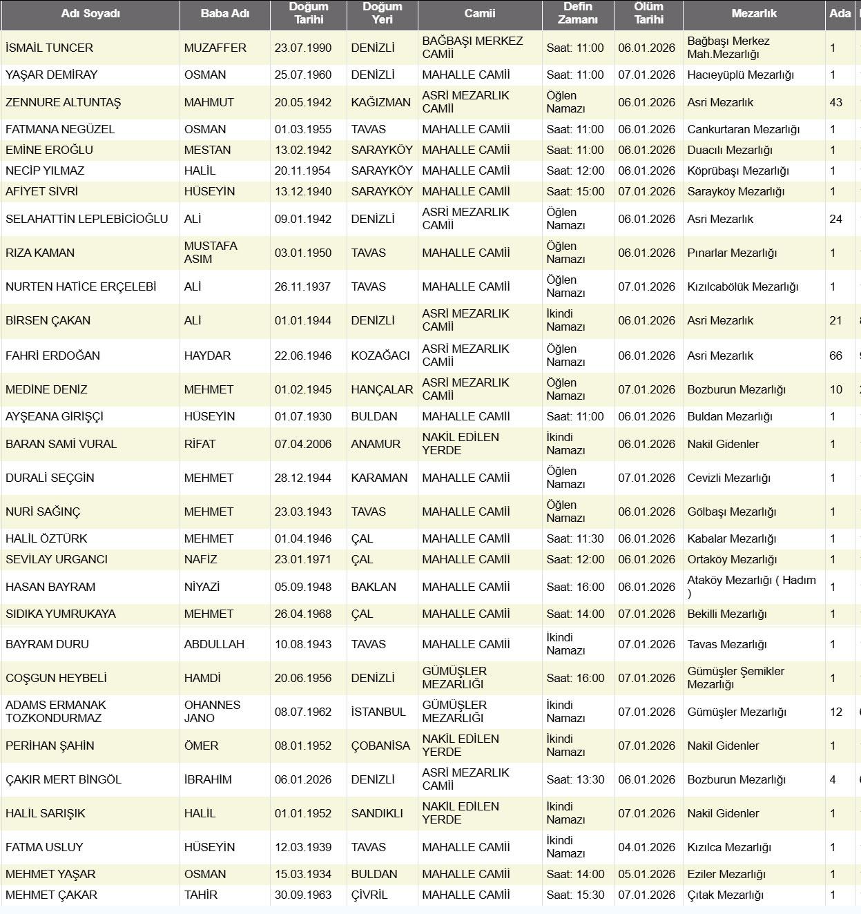 Denizli il sınırları içerisinde vefat edenlerin, cenaze namazlarının kılınacağı cami ve kaldırılacağı mezarlık bilgileri... 07 Ocak 2026 günü Çarşamba Denizli'de vefat edenler.