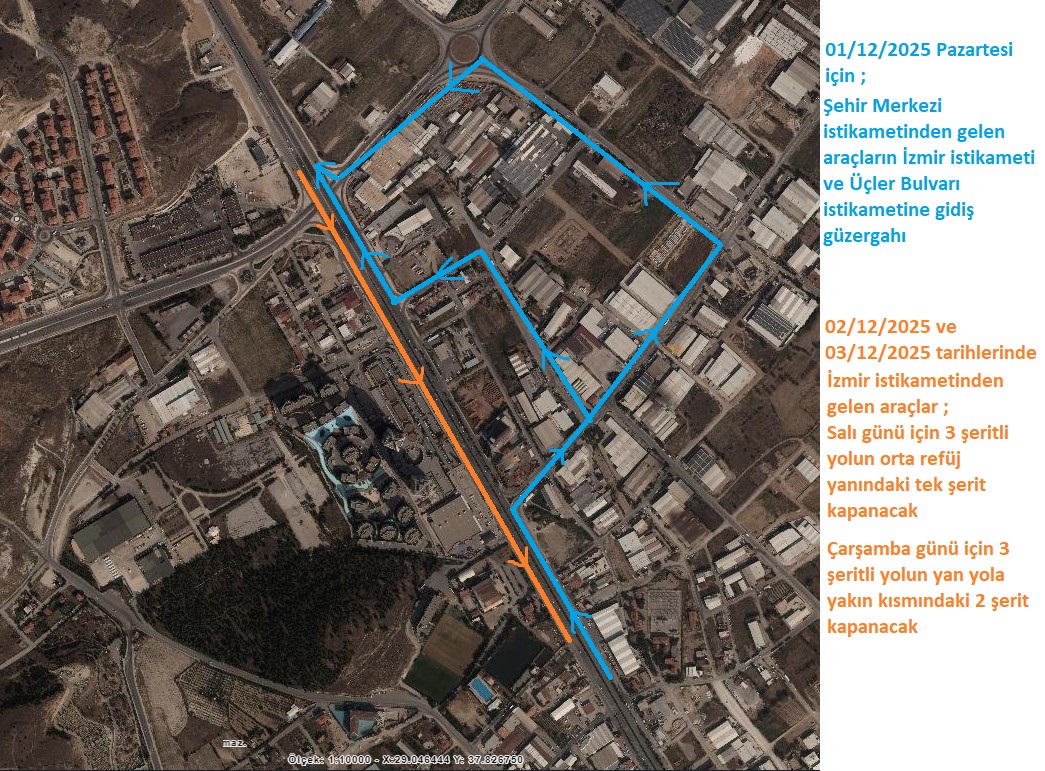 Şehir merkezinden İzmir istikametine gidecek araçlar, Menderes Bulvarı üzerinden Bozburun Caddesi’ne bağlanarak, 7040 Sokak ve Ahmet Nuri Erikoğlu Caddesi güzergâhını kullanıp yeniden Menderes Bulvarı’na ulaşabilecek.