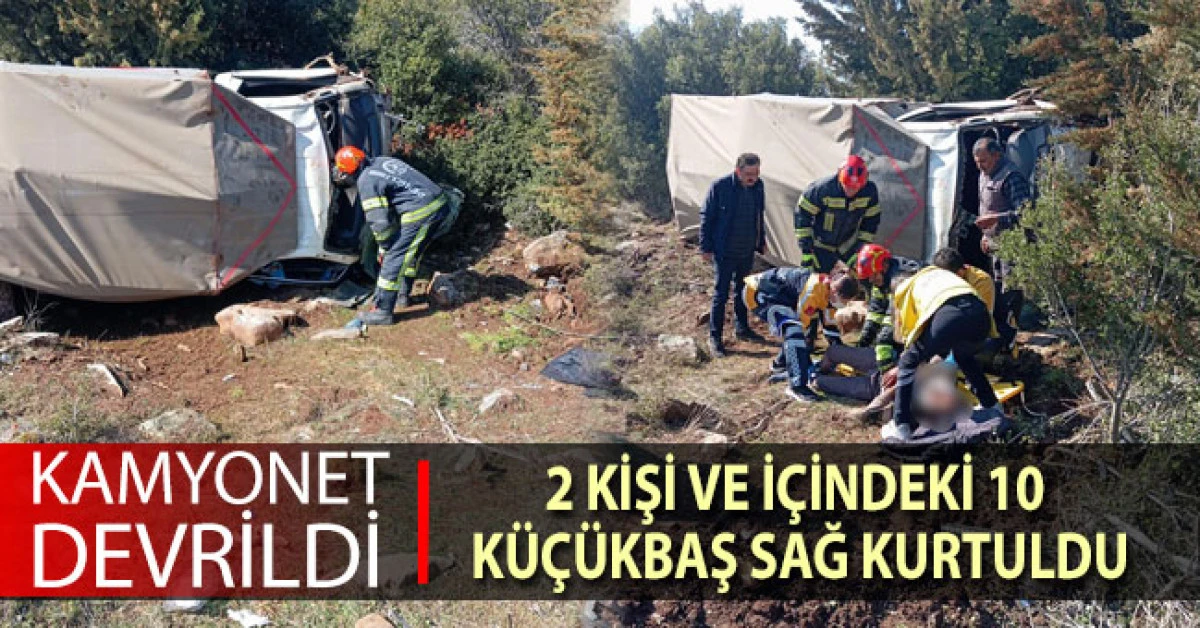 Devrilen kamyonet içerisinde mahsur kalan 2 kişi ve 10 küçükbaş sağ kurtuldu