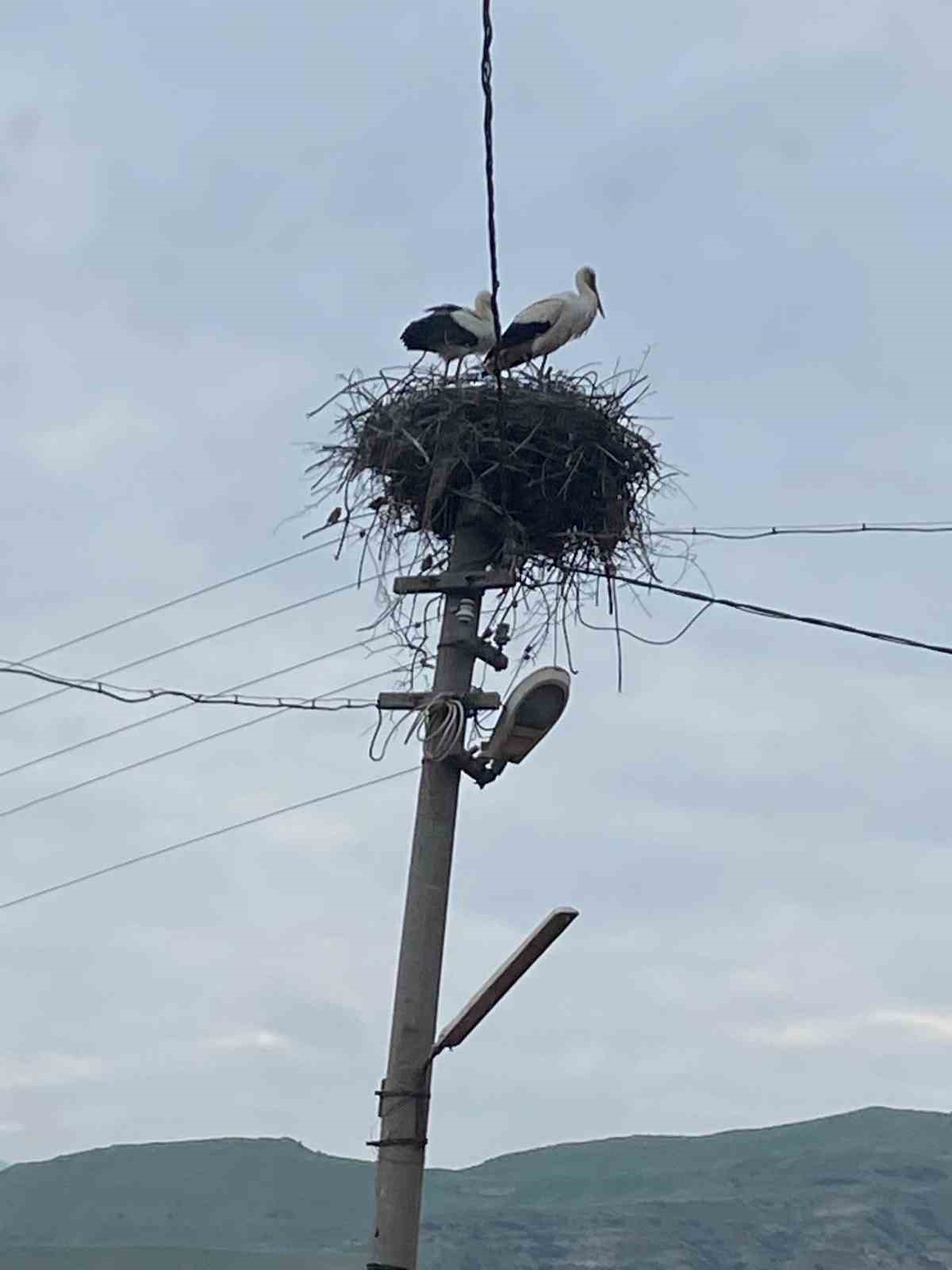 Denizli’nin Buldan ilçesi Yenicekent Mahallesinde bir aydınlatma direğine yuva yapan leylekler geleneği bozmadı.