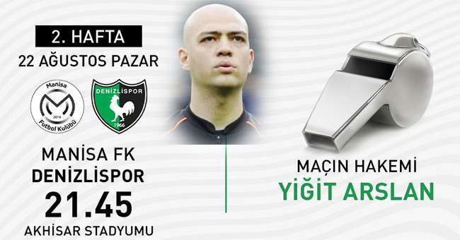 22 Ağustos Pazar günü saat 21.45'de Akhisar Stadyumu'nda oynanacak olan Manisa FK - Denizlispor karşılaşmasını Yiğit Arslan yönetecek.