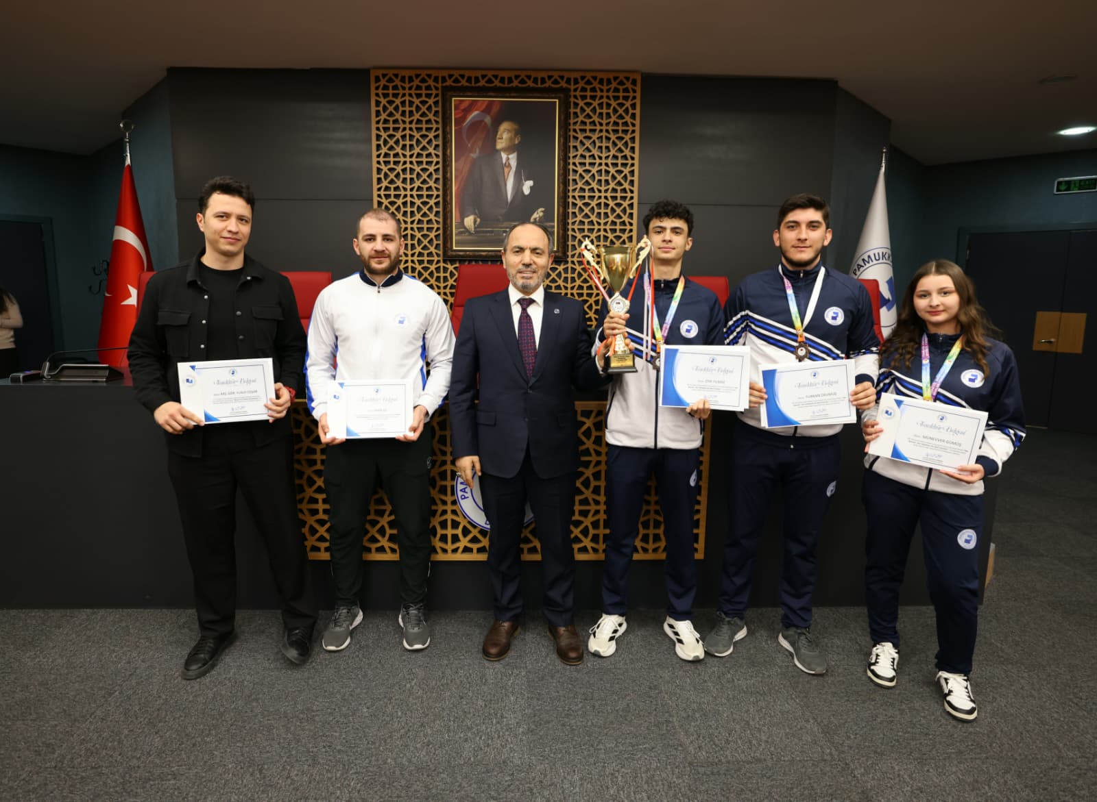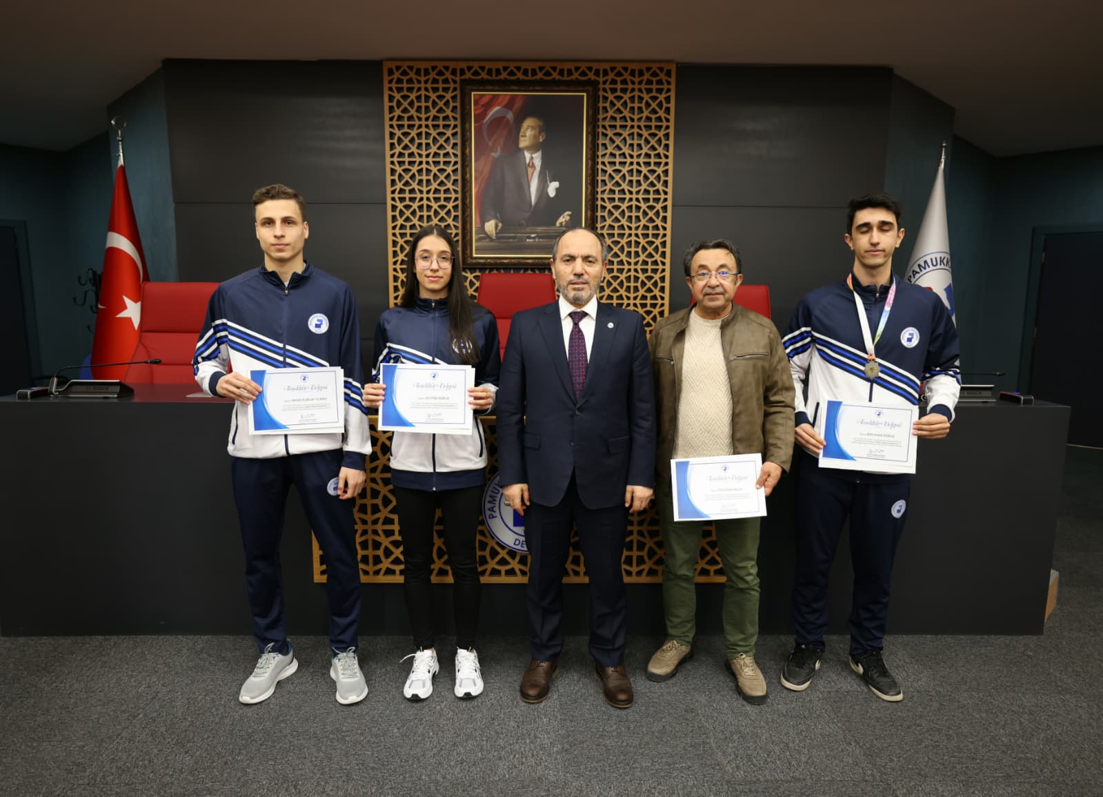 Rektörlük Senato Salonu’nda düzenlenen programda Rektör Prof. Dr. Mahmud Güngör farklı kategorilerde ve farklı üniversitelerde gerçekleşen müsabakalarda derece elde eden PAÜ’lü sporculara teşekkür belgesi takdim ederek antrenörlerine ve tüm sporculara başarılarının devamını diledi.