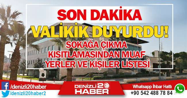 Denizli Valiliği’nden yapılan açıklamada, koronavirüs tedbirleri kapsamında, İçişleri Bakanlığı, koronavirüsle mücadele kapsamında 29 Nisan'da başlayıp 17 Mayıs'a kadar devam edecek "tam kapanma" sürecinde sokağa çıkma kısıtlamasından muaf olan yer ve kişilerin listesini yayınladı.
