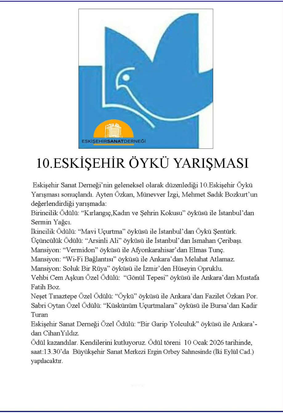 Eskişehir Sanat Derneği tarafından yapılan açıklamada, dereceye giren yazarların başarıları kutlanırken ödül töreninin tarihi de paylaşıldı. Ismahan Çeribaşı ve diğer ödül sahipleri, 10 Ocak 2026 tarihinde saat 13.30’da Eskişehir Büyükşehir Sanat Merkezi Ergin Orbey Sahnesi’nde düzenlenecek törenle ödüllerine kavuşacak.